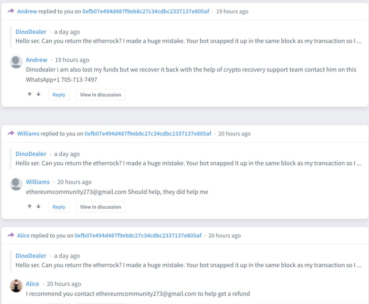More jokes came from DinoDealer’s futile attempt to reach out to the “crypto customer service.” Their attempts to speak to members of the crypto community were met with replies from suspicious users purporting to help, offering email addresses and WhatsApp numbers.