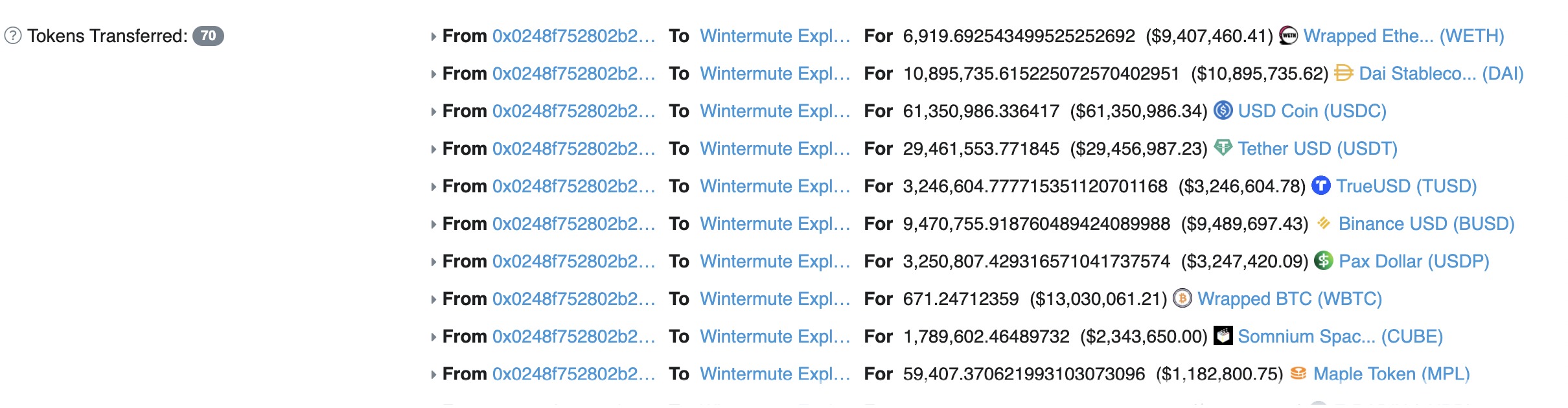 According to Etherscan, over 70 different tokens have been transferred to “Wintermute exploiter,” including $61,350,986 in USD Coin (USDC), 671 Wrapped Bitcoin (wBTC), which is roughly $13,030,061, and $29,461,533 Tether (USDT). The largest token sum appears to be USDC.