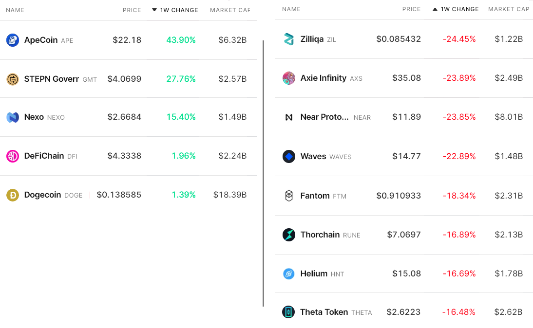 Apecoin (APE) rallied 44% due to the upcoming Otherside metaverse land auction scheduled for April 30. The Otherside is being developed by Yuga Labs, Animoca Brands and the Bored Ape Yacht Club NFT team and NFT investors have high expectations for the project.