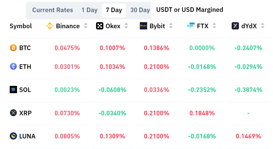As shown above, the accumulated seven-day funding rate is slightly positive for Bitcoin and Ether. Data indicates slightly higher demand from longs (buyers), but nothing that would force traders to close their positions. For instance, Luna’s positive 0.15% weekly rate equals 0.6% per month, which should not concern most futures traders.