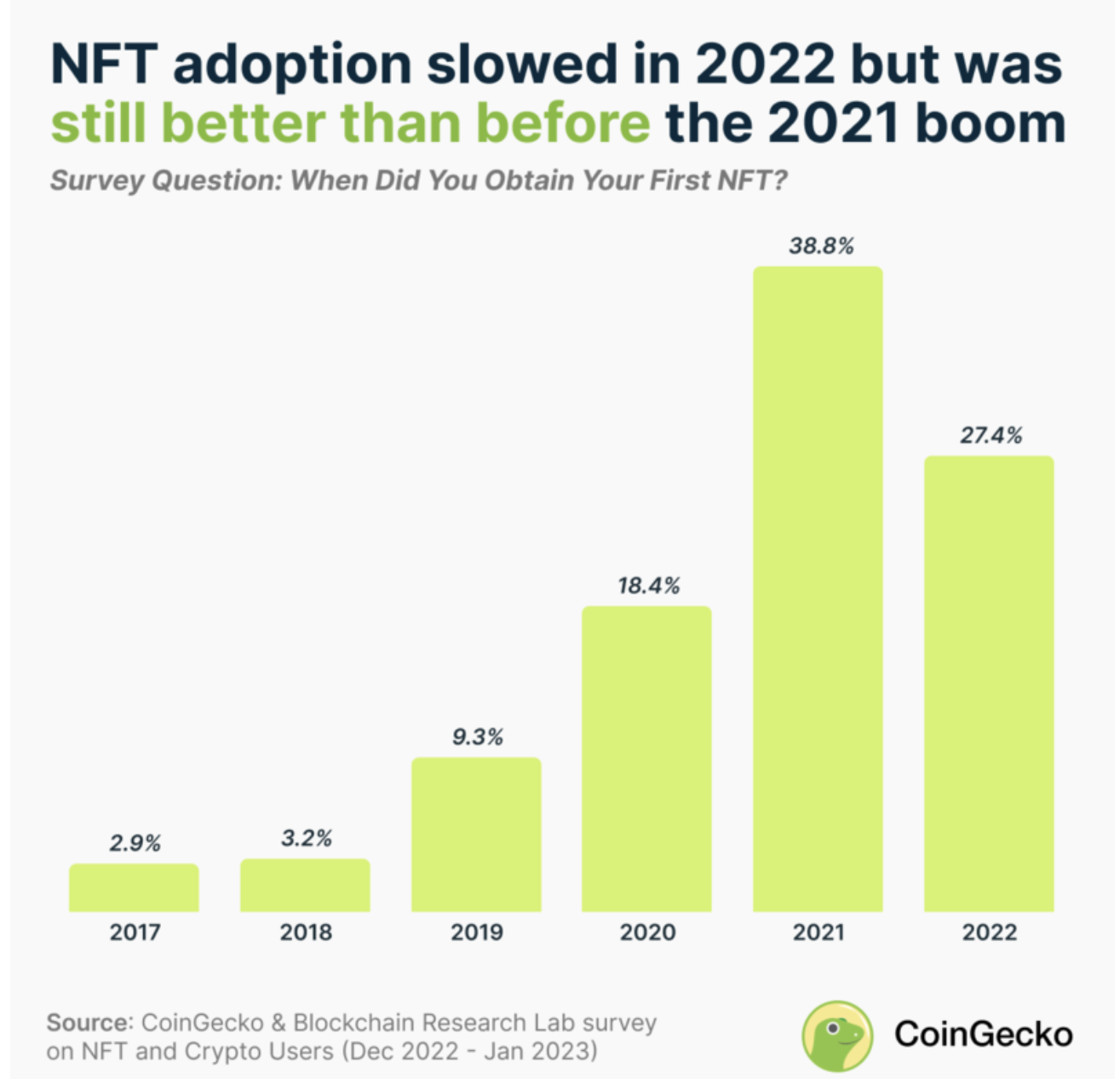 Meanwhile, only 2.9% acquired their first NFT in 2017, the same year Crypto Kitties and CryptoPunks were launched.