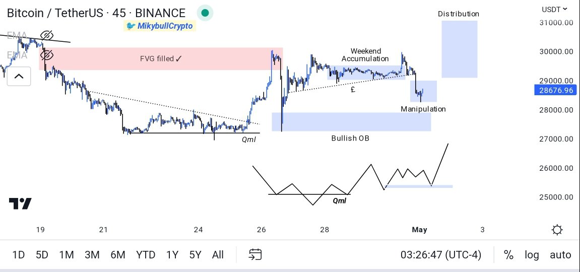 Holding above $29.2K, and still facing a potential correction to $28.3K as the ideal trigger for new longs. pic.twitter.com/3GJY8wImR9— Michaël van de Poppe (@CryptoMichNL) April 30, 2023