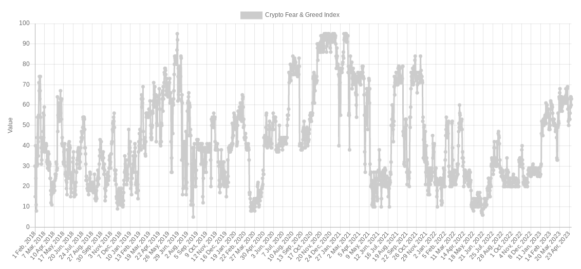 The latest readings from the Crypto Fear & Greed Index show that market “greed” is trending back toward levels last seen at Bitcoin’s $69,000 all-time highs in November 2021.