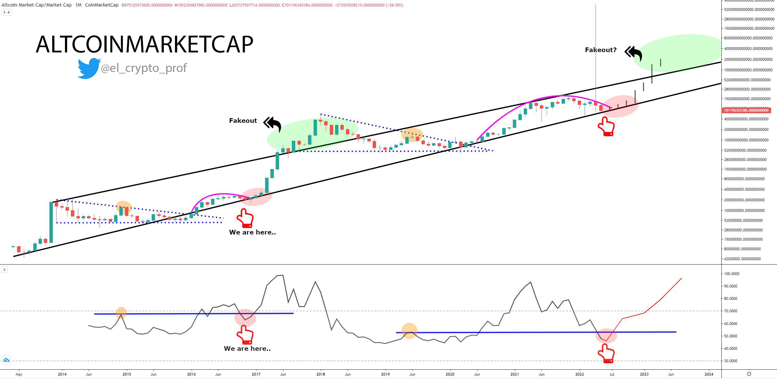 “When it comes to altcoins, I can see the following scenario playing out. There are just too many similarities with the previous cycle. RSI also looks incredible. The next wave up will leave many behind.”