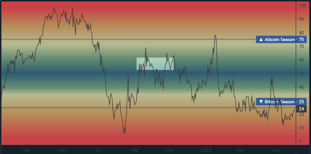 Based on the past performance of the index, it has taken a minimum of two to three months for it to climb from the area indicating that it is Bitcoin season to the altcoin season level. Current projections, according the the indicator, suggest that an altcoin season might not start until August or September 2022.