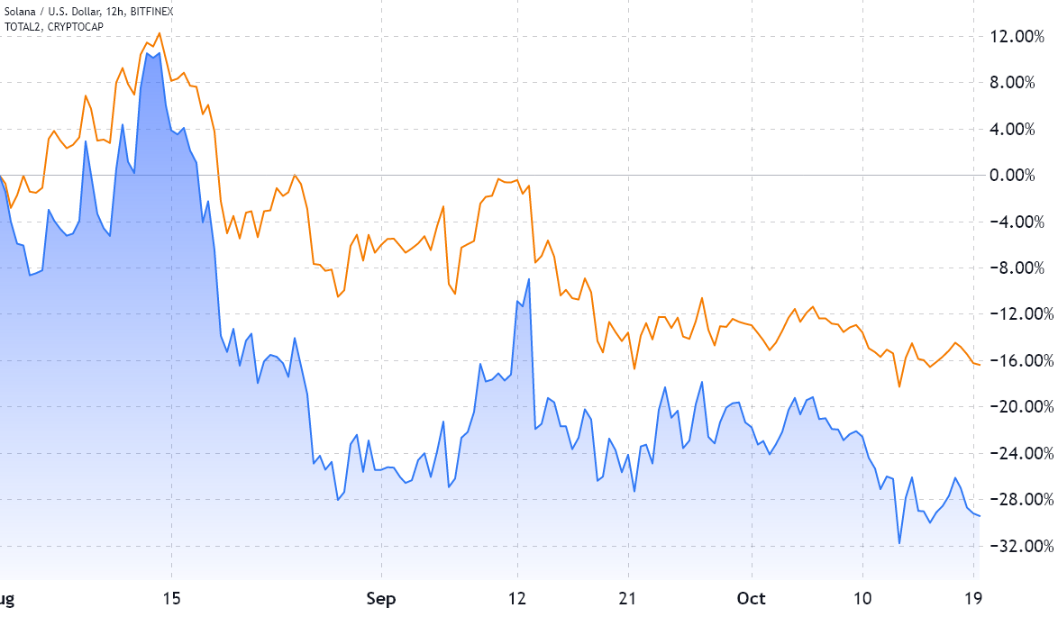 Solana’s (SOL) downfall has been even more brutal, with the altcoin facing a 29% correction since August. The smart contract network focuses on low fees and speed, but the frequent outages highlight a centralization issue.