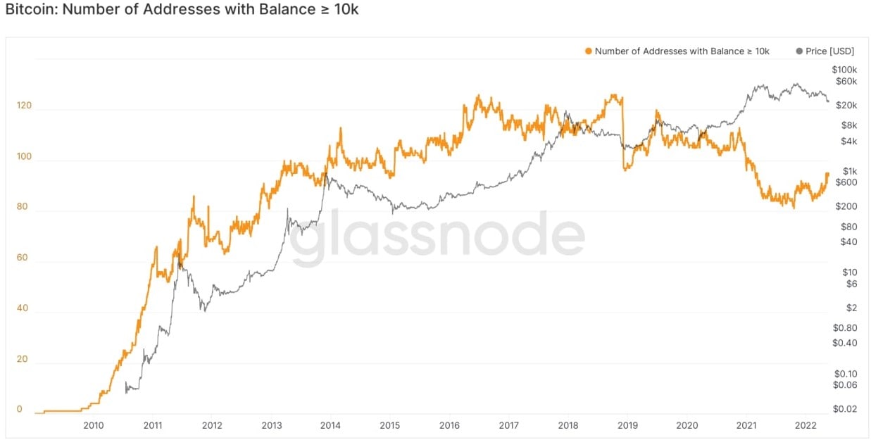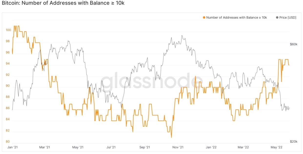 A close look at the past three months shows that while the market has been selling off, the number of wallets holding at least 10,000 BTC has been climbing.