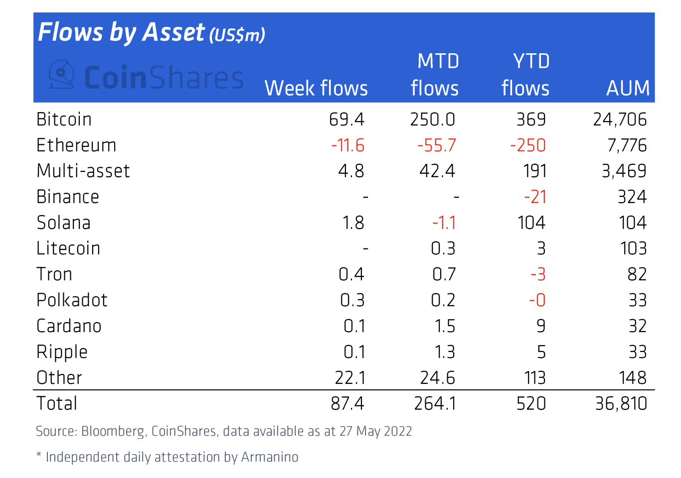 Meanwhile, Solana (SOL) and Cardano (ADA), layer-one blockchain protocols competing with Ethereum, have attracted $104 million and $9 million, respectively.
