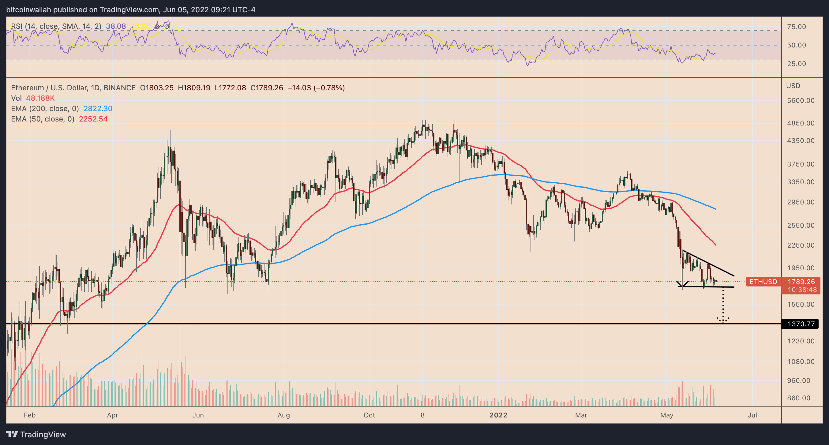 In detail, Ether has been fluctuating inside a range defined by a horizontal trendline support and a falling trendline resistance. The pattern looks more or less like a “descending triangle,” a bearish continuation pattern when formed during a downtrend.