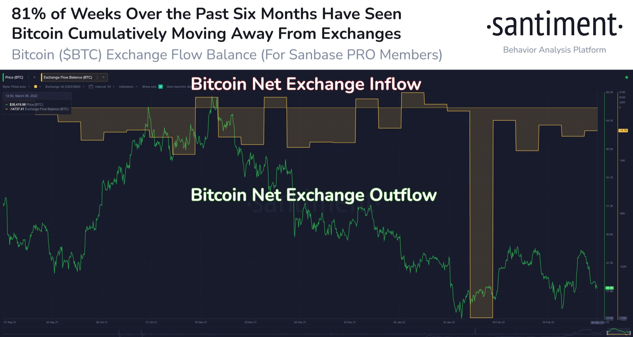 Data from crypto analytics service Santiment shows that the Bitcoin weekly outflow from exchanges has been positive 81% of all time since October 2021, even as BTC trades near its six-month low.