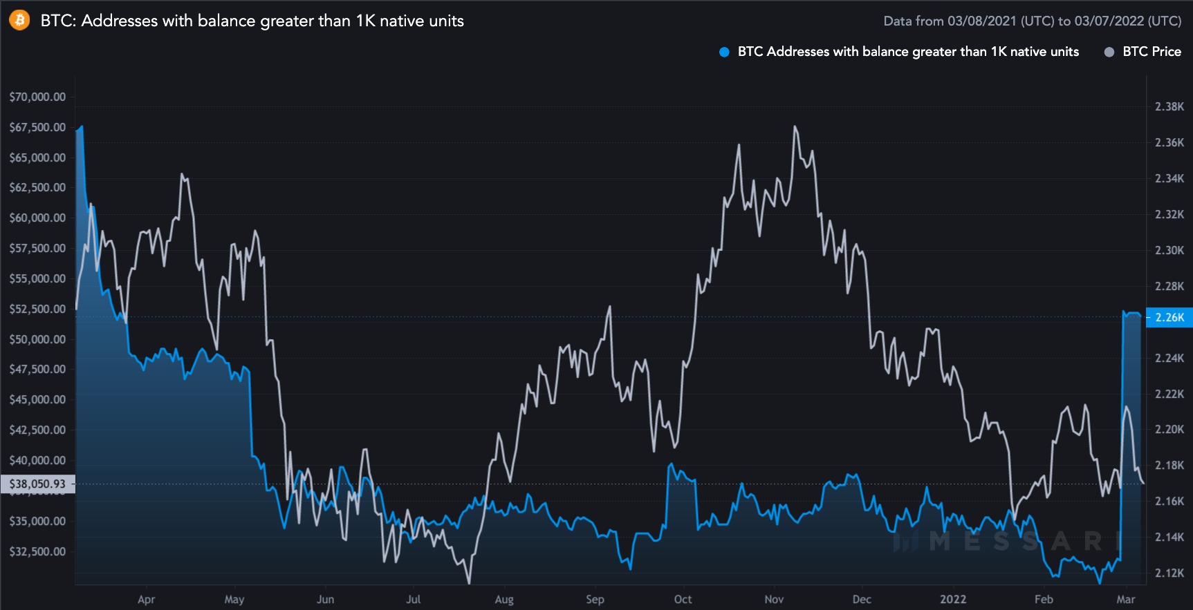For instance, the number of Bitcoin addresses that hold at least 1,000 BTC spiked from 2,127 on Feb. 27 to 2,266 on Feb. 28.