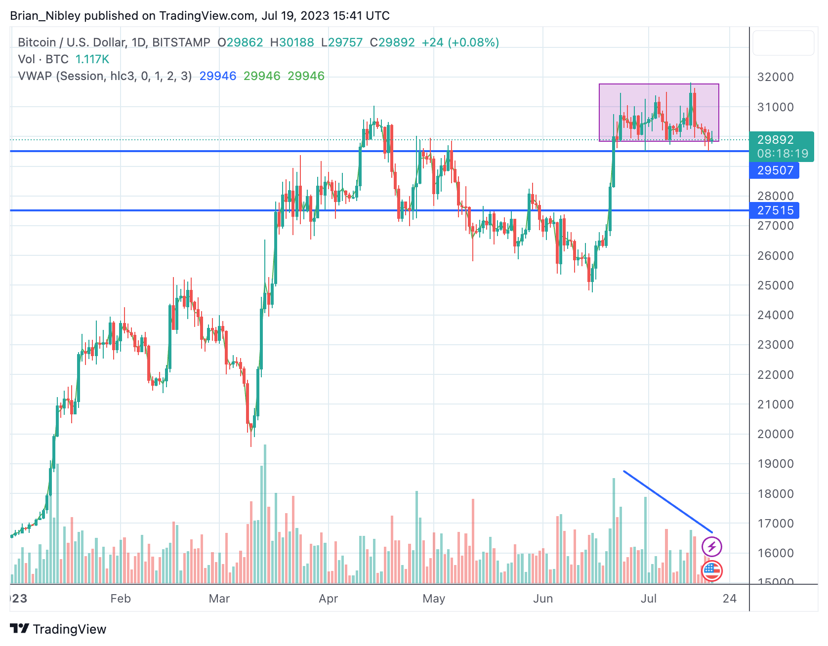 After a spectacular first half of 2023, the price of Bitcoin (BTC) appears to have stalled out, being stuck between $29,000 and $31,500.