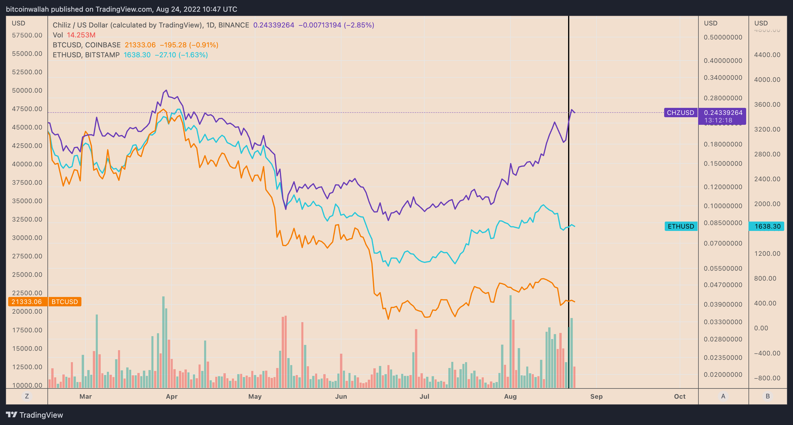 https://images.cointelegraph.com/images/840_aHR0cHM6Ly9zMy5jb2ludGVsZWdyYXBoLmNvbS91cGxvYWRzLzIwMjItMDgvYjAzODNmOTUtNjA4MS00MWQ0LTkwMjAtMmYxNjIyNjQzM2Y1LmpwZWc=.jpegThe price of Chiliz (CHZ) has surged by approximately 35% week-to-date (WTD) to reach $0.26 per token on Aug. 24. In doing so, the token has outperformed Bitcoin (BTC) and Ether (ETH), which have been wobbling between gains and losses in the same period.