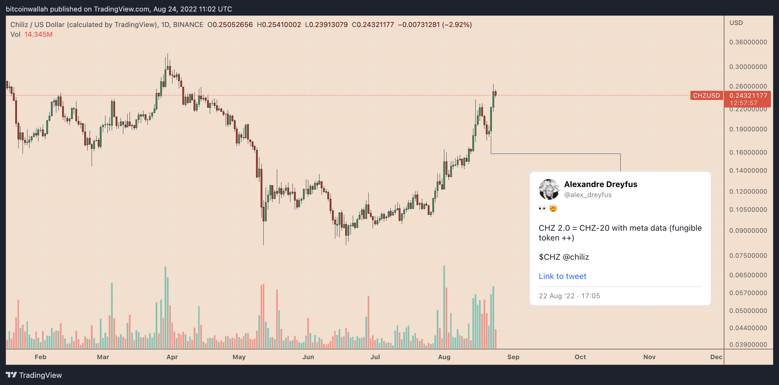 The announcement coincided with CHZ undergoing a 19% intraday price rally on Aug. 22, accompanied by a spike in trading volume. From a technical perspective, the move showed traders’ conviction in the CHZ 2.0 announcement