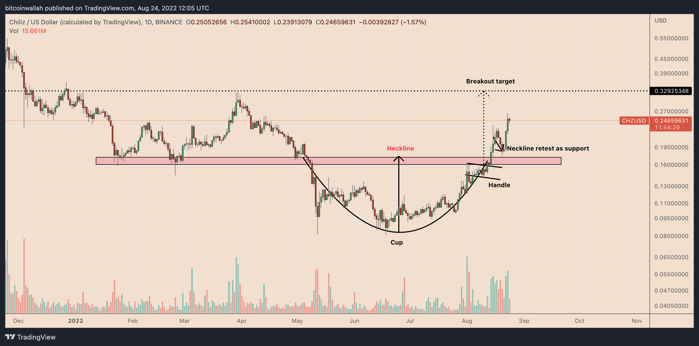 On the daily chart, CHZ broke out of its prevailing cup and handle setup on Aug. 14 after closing above the pattern’s neckline range (the red bar), as shown below. A cup and handle pattern is considered a bullish reversal setup by traditional chart analysts.