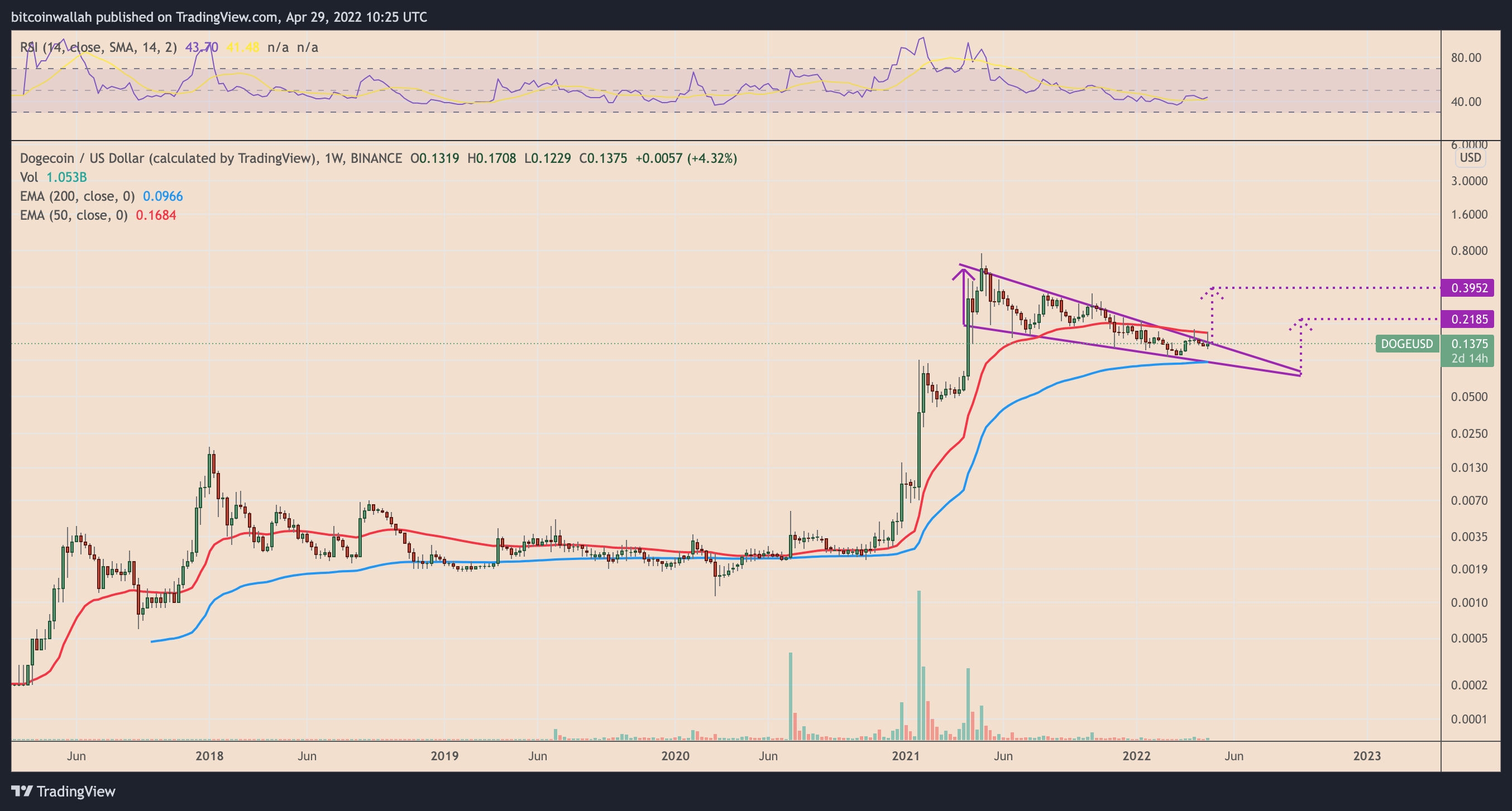 Dogecoin has been painting a “falling wedge” pattern on its longer-timeframe charts since May 2021, hinting at potential for a bullish reversal in the coming months.
