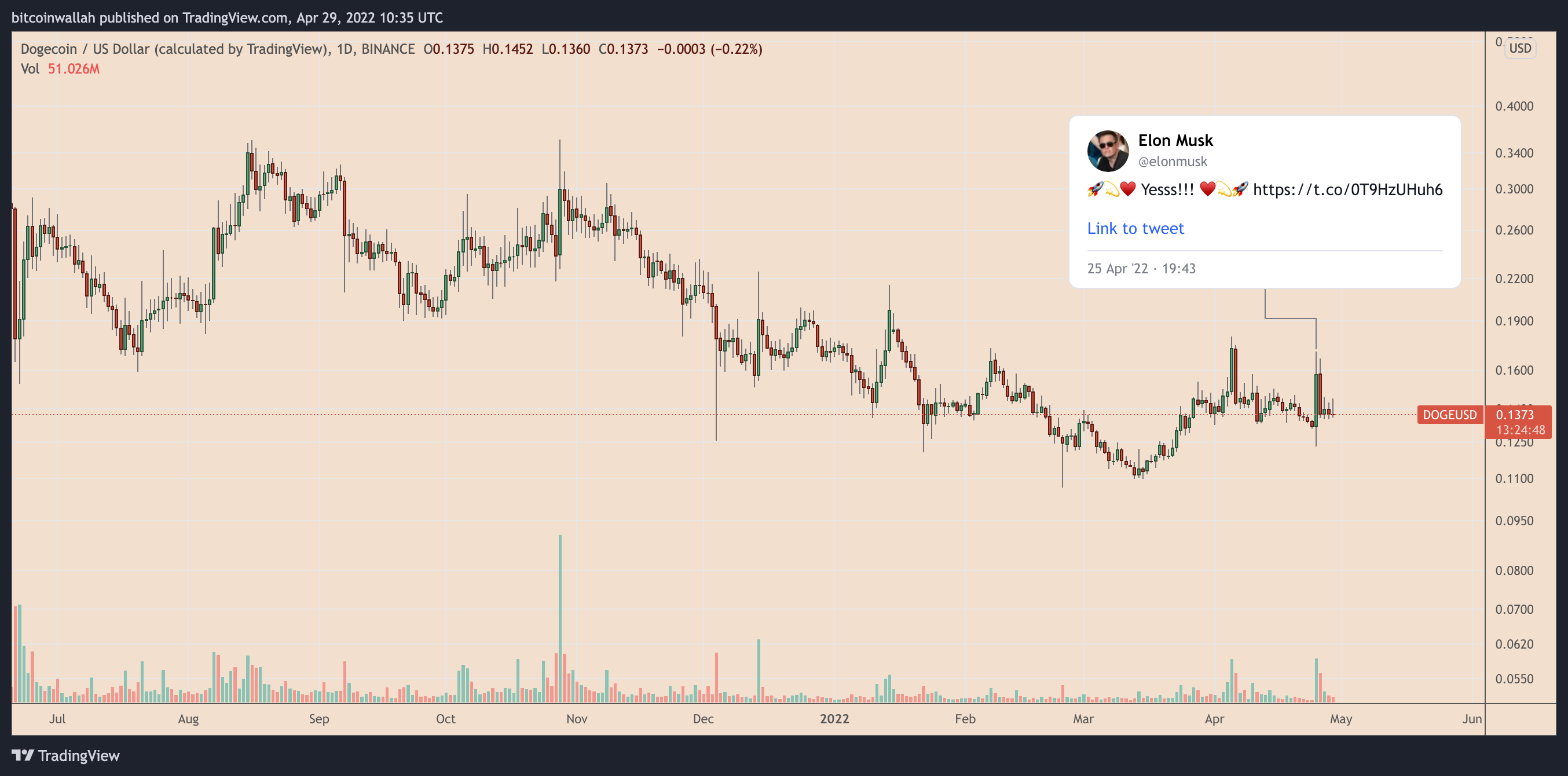 Earlier this week, Twitter announced that it had accepted Elon Musk’s bid to buy its social media platform for $4 billion. Dogecoin price reacted bullishly on the possibility that Musk would integrate DOGE as one of the official payment mediums for Twitter’s subscription services, based on his recent recommendations to the company’s board.