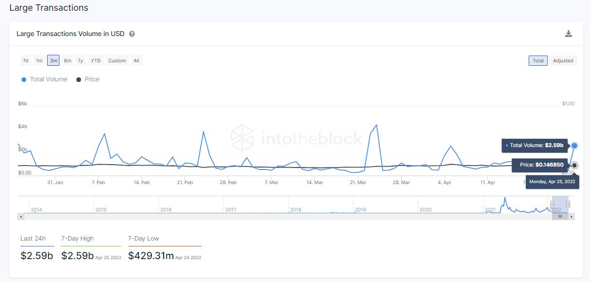 For instance, internet queries for the keyword “buy Dogecoin” shot up by 392% on April 25, according to Google Trends. Meanwhile, the volume of on-chain DOGE transactions with a value exceeding $100,000 reached $2.59 billion on the same day.