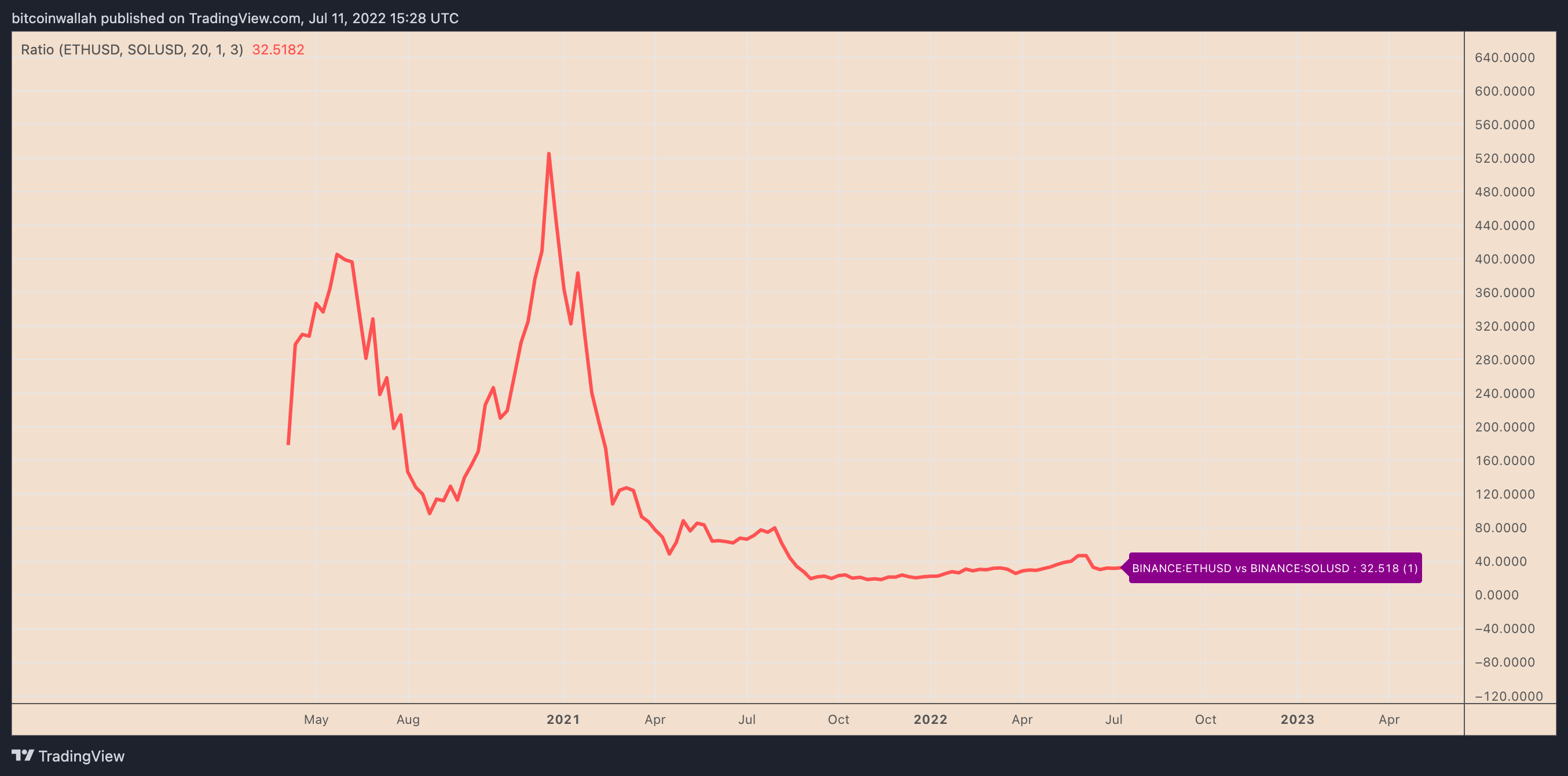The Ethereum/Solana market cap ratio is currently around 32.5 versus the December 2020 peak of 525.3, according to data tracked by TradingView.