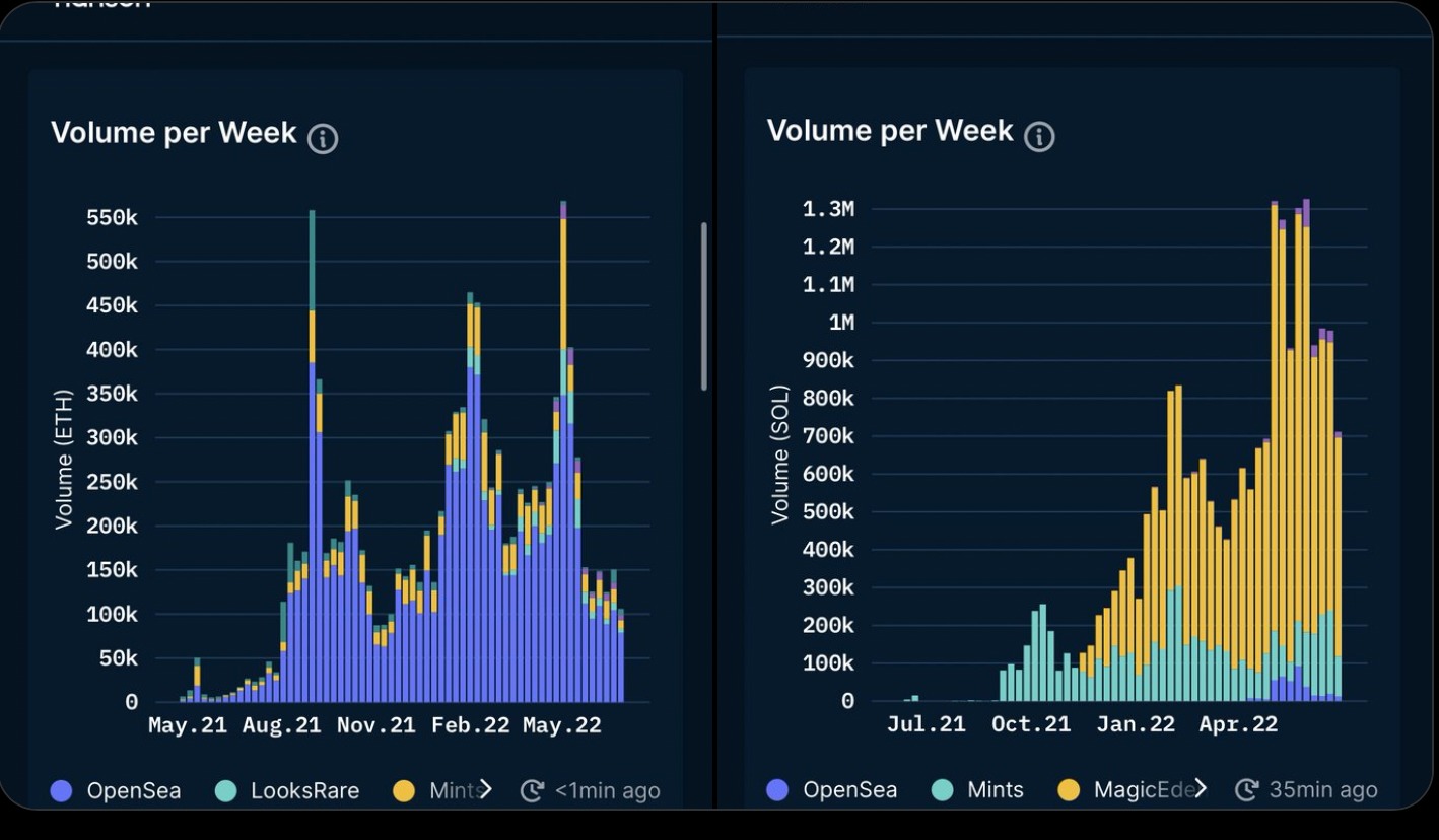 For instance, according to Nansen, Solana’s weekly volumes across major nonfungible token (NFT) marketplaces, including OpenSea and MagicEden, have been in a constant uptrend, whereas Ethereum’s have tapered off in recent months.