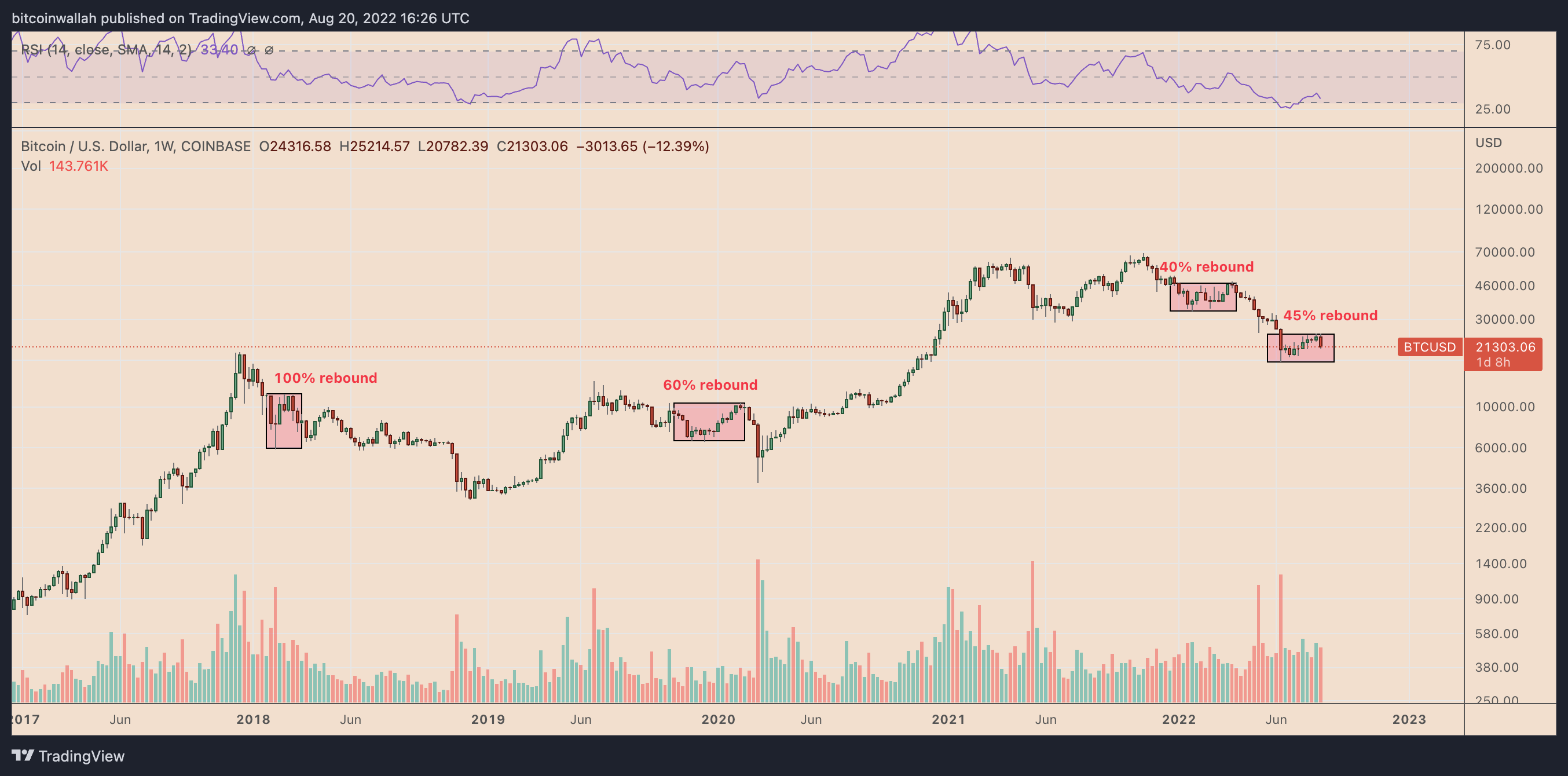 BTC’s price rebounded by nearly 100%—from around $6,000 to over $11,500—during the 2018 bear market cycle, only to wipe-off the gains entirely and drop toward $3,200. Notably, similar rebounds and corrections also took place in 2019 and 2022.