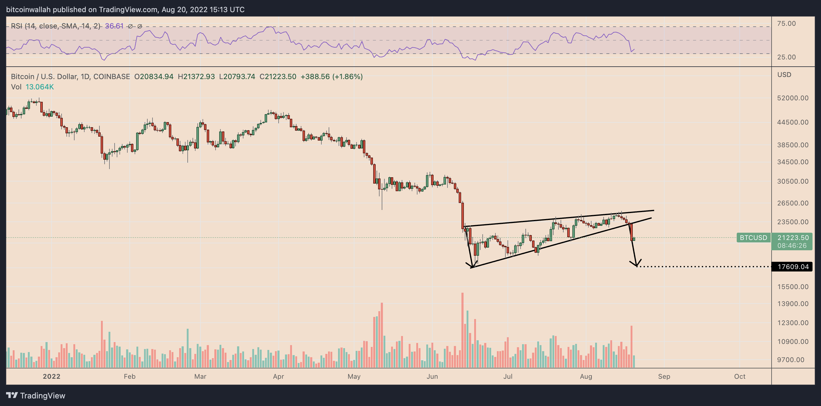 Bitcoin’s price decline this week has triggered a rising wedge breakdown, suggesting more losses for the crypto in the coming weeks.