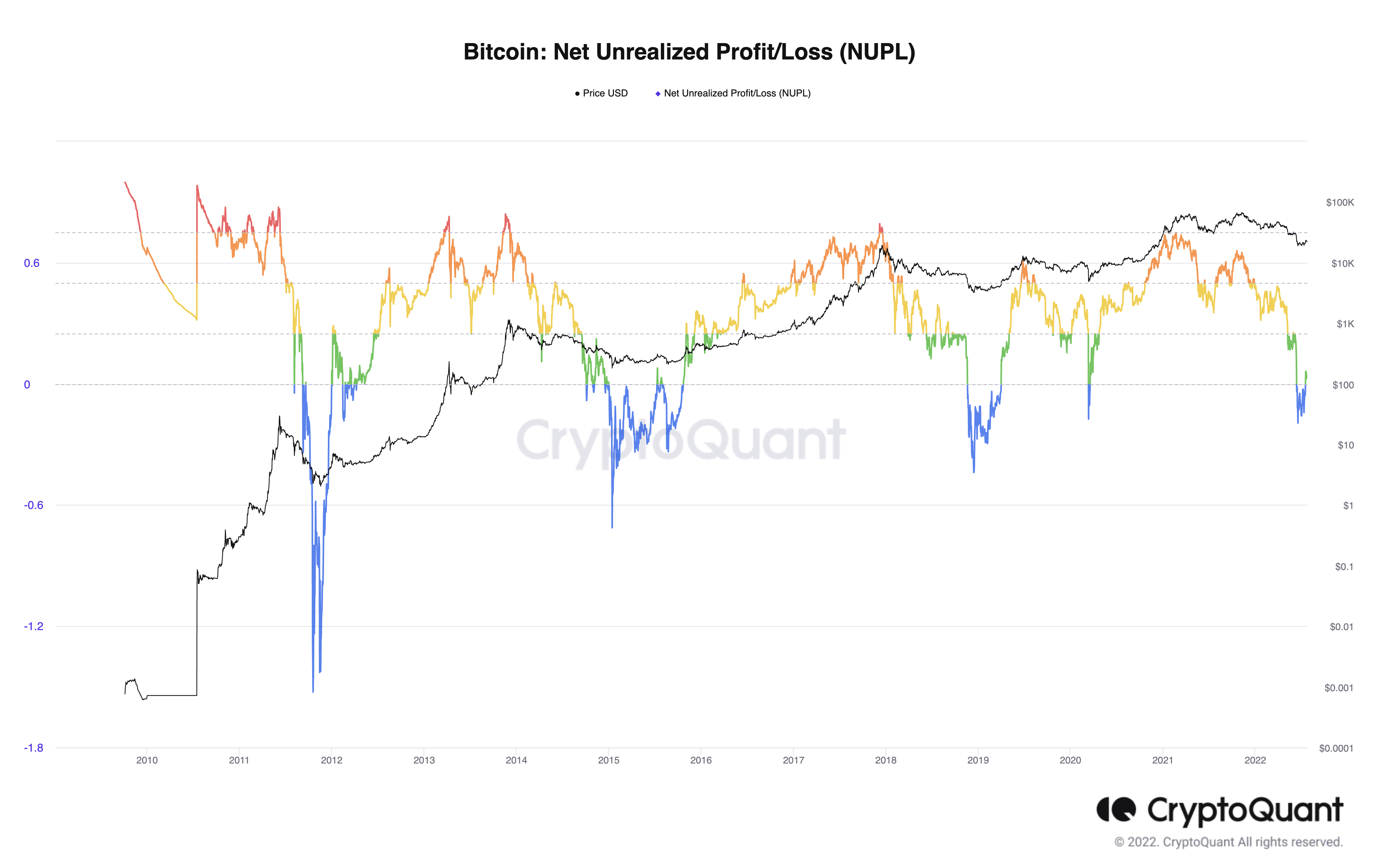 Another sign of a potential Bitcoin macro bottom comes from its net unrealized profit and loss (NUPL) indicator.