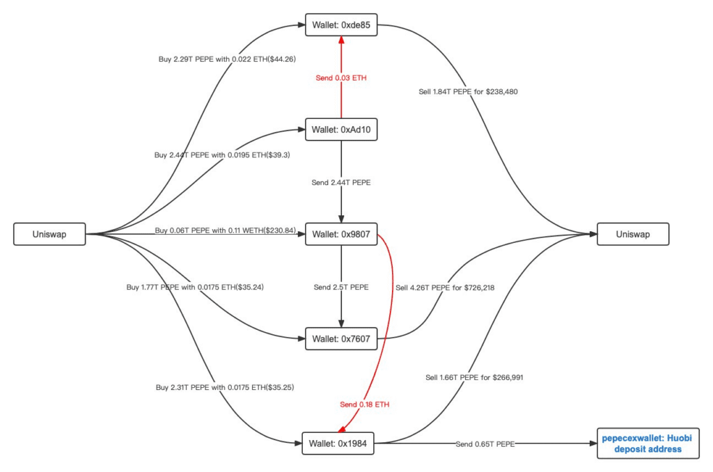 For instance, Lookonchain revealed that five addresses allegedly linked to the Pepe team made a $1.23 million profit in a thin liquid market. They purchased 8.87 trillion PEPE tokens at a low price and sold over 90% of their holdings at a higher price on Uniswap.