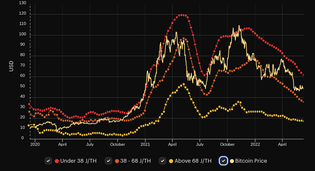 The Index, which shows the current price in USD per terahash (TH) according to ASIC miner efficiency, confirms that that cost area has been decreasing incrementally since December 2021.