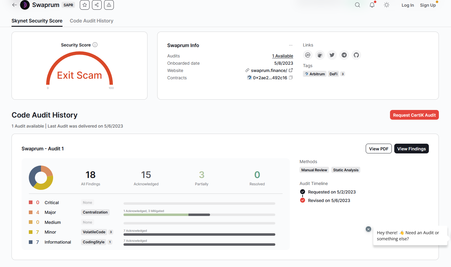 However, it is worth noting that as per CertiK’s disclaimers, it “conducts security assessments on the provided source code exclusively,” and can’t guarantee that its recommendations are integrated. In the audit, CertiK flagged a “major” issue with how centralized Swaprum was.