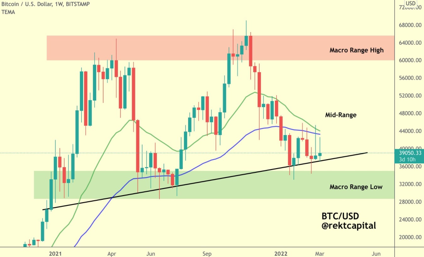 Insight into the recent volatility for Bitcoin was offered by crypto trader and pseudonymous Twitter user ‘Rekt Capital’, who posted the following chart noting that “BTC is still consolidating between the green higher low support and the blue 50-week EMA resistance.”