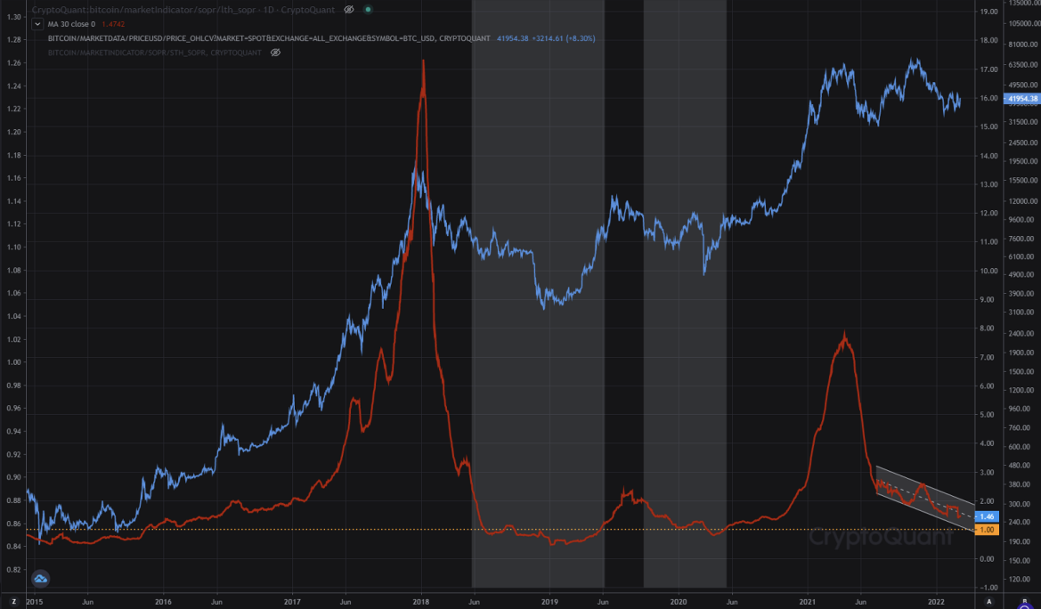 According to the report, the long-term holder SOPR has been trending down since Bitcoin’s price hit its peak in November 2021,” and currently it trades “around the 1.5 handle.”