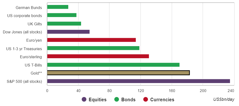 According to the above data, BTC’s current $837 million market capitalization translates to roughly 7% of gold. To assess how those markets are valued, one should compare their daily traded volume and institutional holdings.