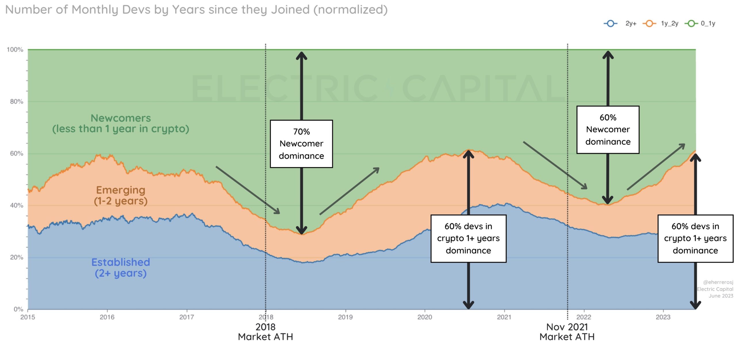 Newcomer developers typically enter the cryptocurrency sector around market peaks. There was a 70% dominance of newcomer developers six months after January 2018’s cryptocurrency market peak. This was followed by a 60% newcomer dominance in the six months following the November 2021 market all-time high.