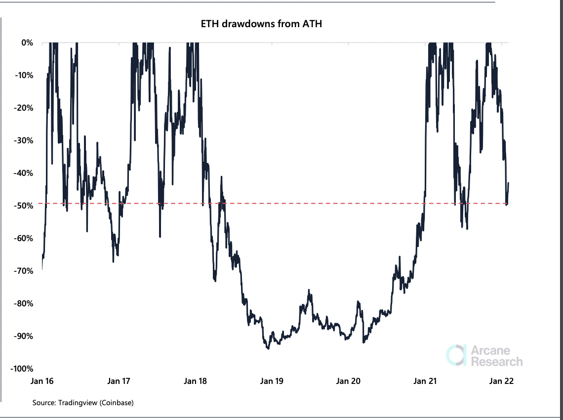 “ETH decreased 94% from its ATH during the 2018 crypto winter, compared to the 50% dip in March 2016, which recovered in just 67 days,” Arcane Research wrote, adding: