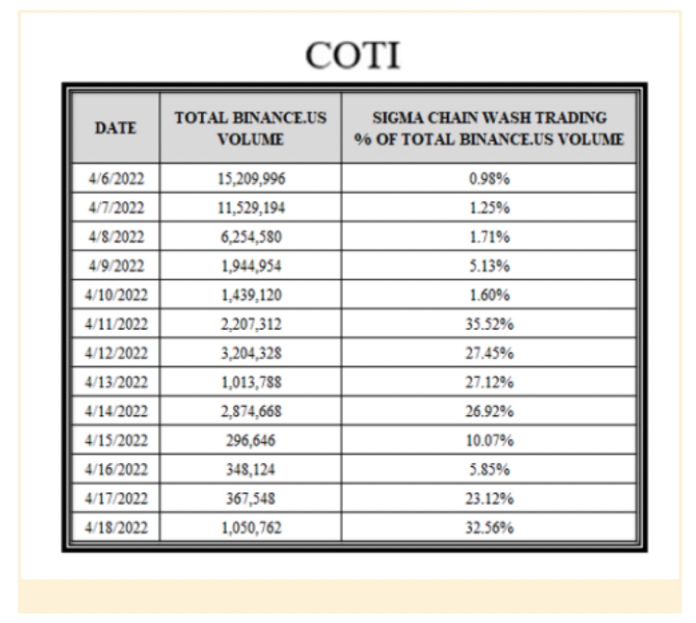 Wash trading between Sigma Chain’s accounts continued after the platform’s introduction in 2019 until at least June 2022. For instance, following the introduction of the crypto asset security COTI on the Binance.US platform on April 6, 2022, Sigma Chain quickly — the SEC alleges — became involved in extensive wash trading . Strategically, the platform’s launch, the introduction of new securities, and the funding round all fell during times when investors and equity investors were most vulnerable.
