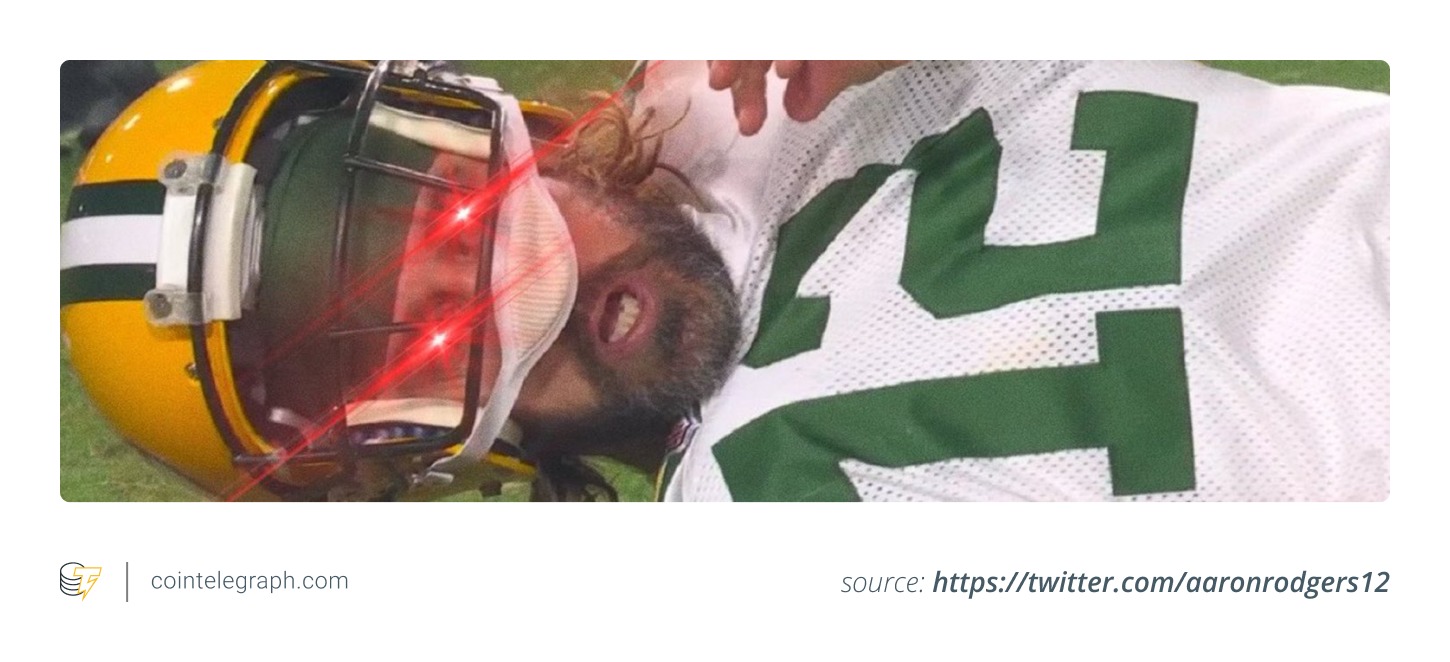 The Twitter profile for the star quarterback for the Green Bay Packers features a picture of himself on the field during a game with the iconic laser eyes, further signaling his support for BTC.