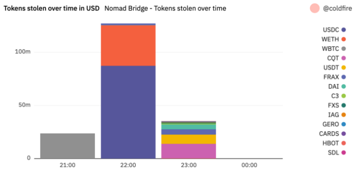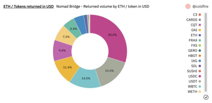 As the wBTC, USDC and wETH tokens were present in the largest concentrations in the Nomad Bridge, it made sense for the original hackers to first extract these tokens.