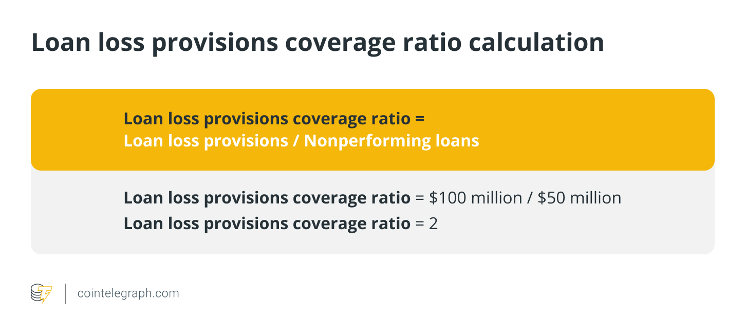For example, let’s say a bank has loan loss provisions of $100 million and nonperforming loans of $50 million. The loan loss provisions coverage ratio for this bank would be: