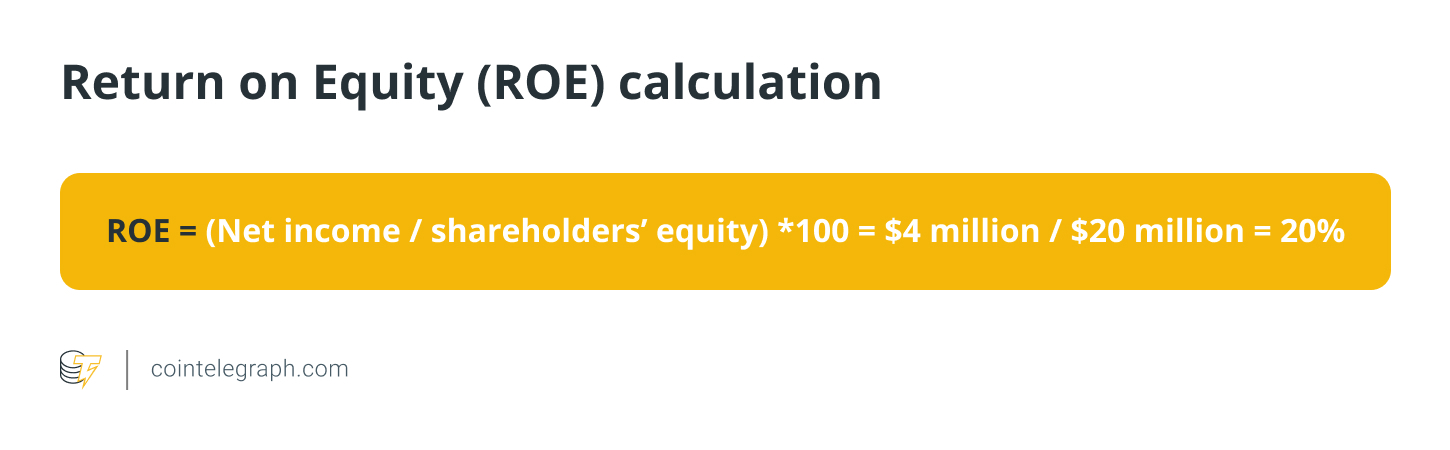 Suppose that Bank B has a net income of $4 million and shareholders’ equity of $20 million. Now, its ROE will be: