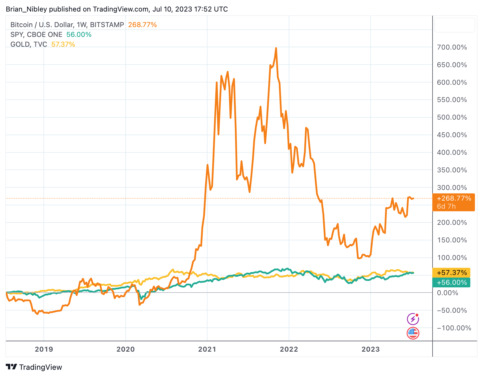 On a five-year basis, BTC/USD is up 376%. Compare this to about 55% for the S&P 500 or gold.