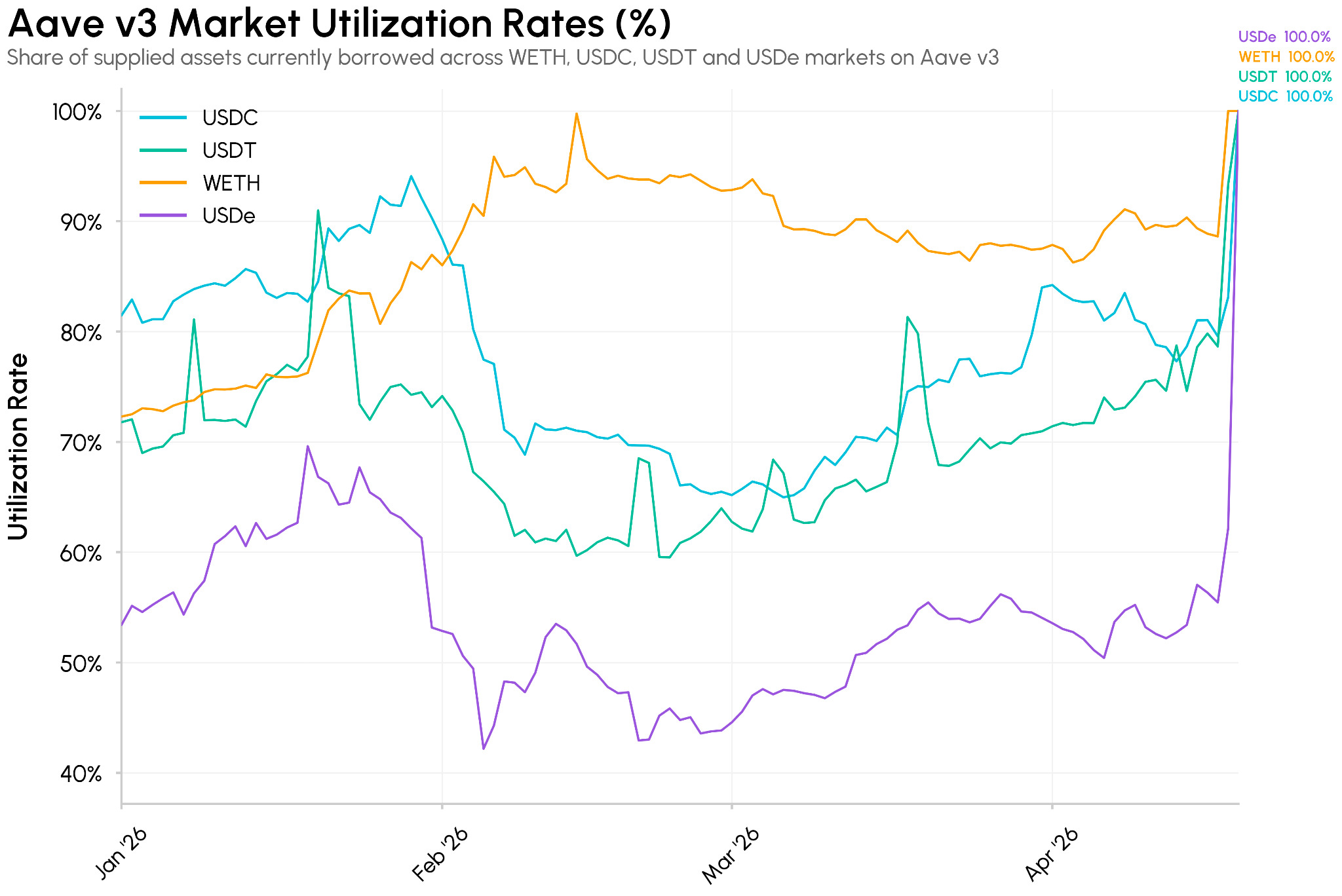 The bad debt created by the Kelp exploiter resulted in Aave’s v3 Wrapped Ether (WETH) market temporarily reaching 100% utilization and leaving no liquidity available for immediate withdrawals, Talos said in a Tuesday report.