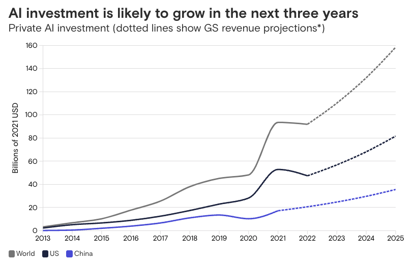 Projection of AI investment growth globally and in the U.S., China over next three years. Source: Goldman Sachs