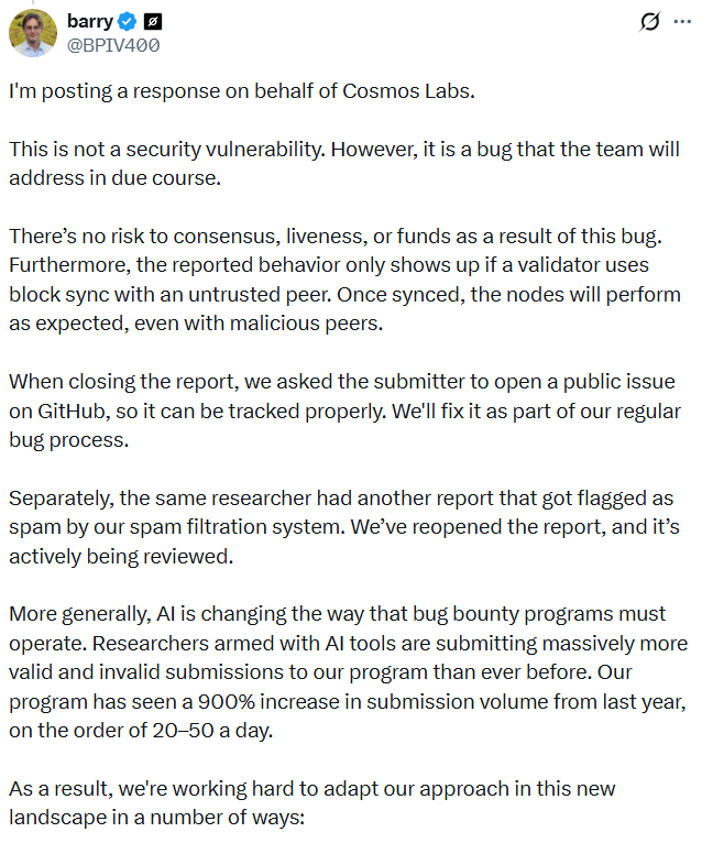 “AI is changing the way that bug bounty programs must operate,” said Barry Plunkett, co-CEO of Cosmos Labs, on Tuesday, responding to a bug bounty hunter who accused the protocol of ignoring their vulnerability report.