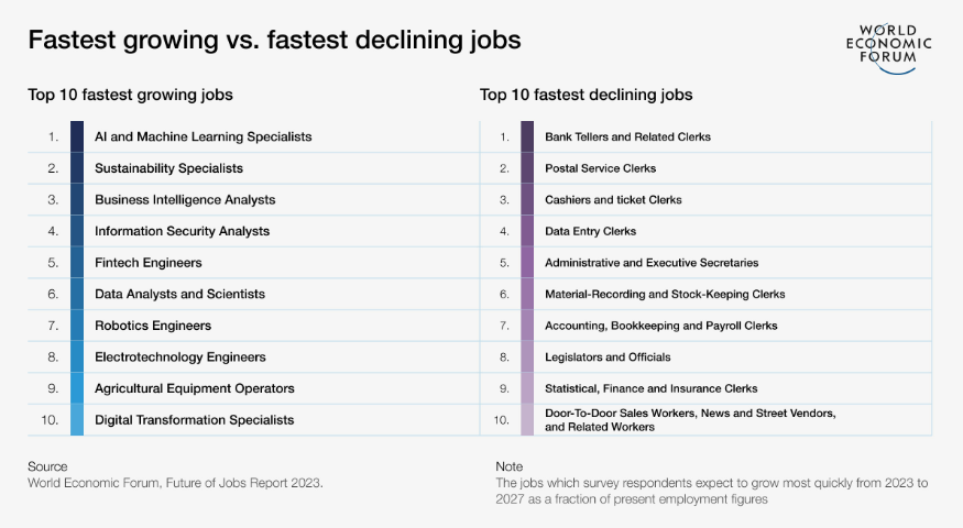 The prospect of job losses due to AI has also been something the Wold Economic Forum (WEF) has been closely monitoring. It released “The Future of Jobs Report 2023” on April 30, which predicts that clerical or secretarial roles such as bank tellers and data entry clerks would be hit the hardest.