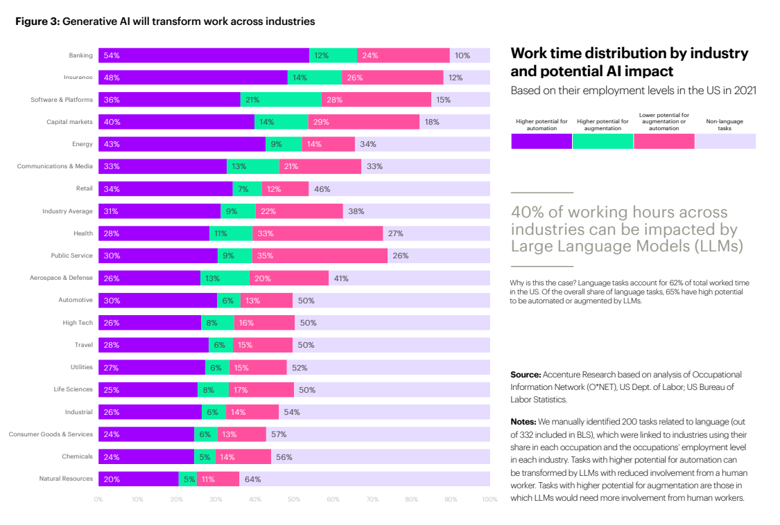 Accenture’s research found that 40% of working hours across different industries could be affected by LLMs, and identified banking as the industry most likely to be affected as 54% of tasks were found to have a high potential for automation, closely followed by insurance at 48%.