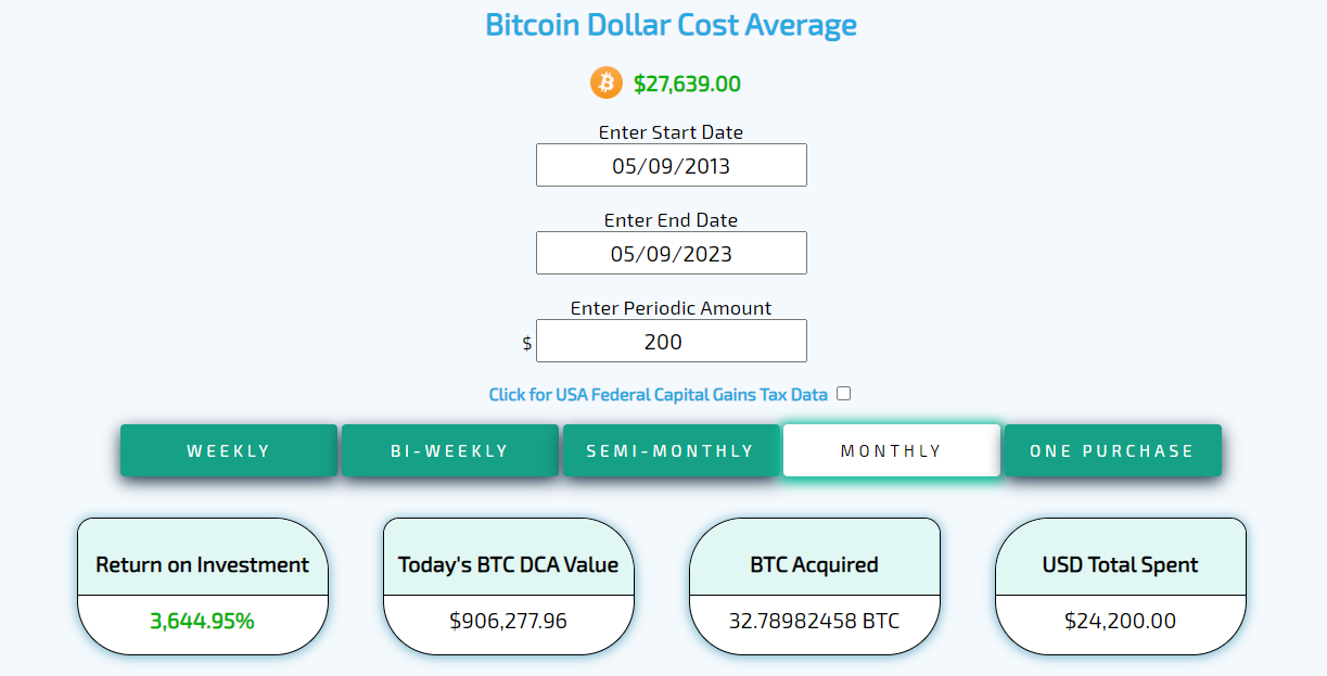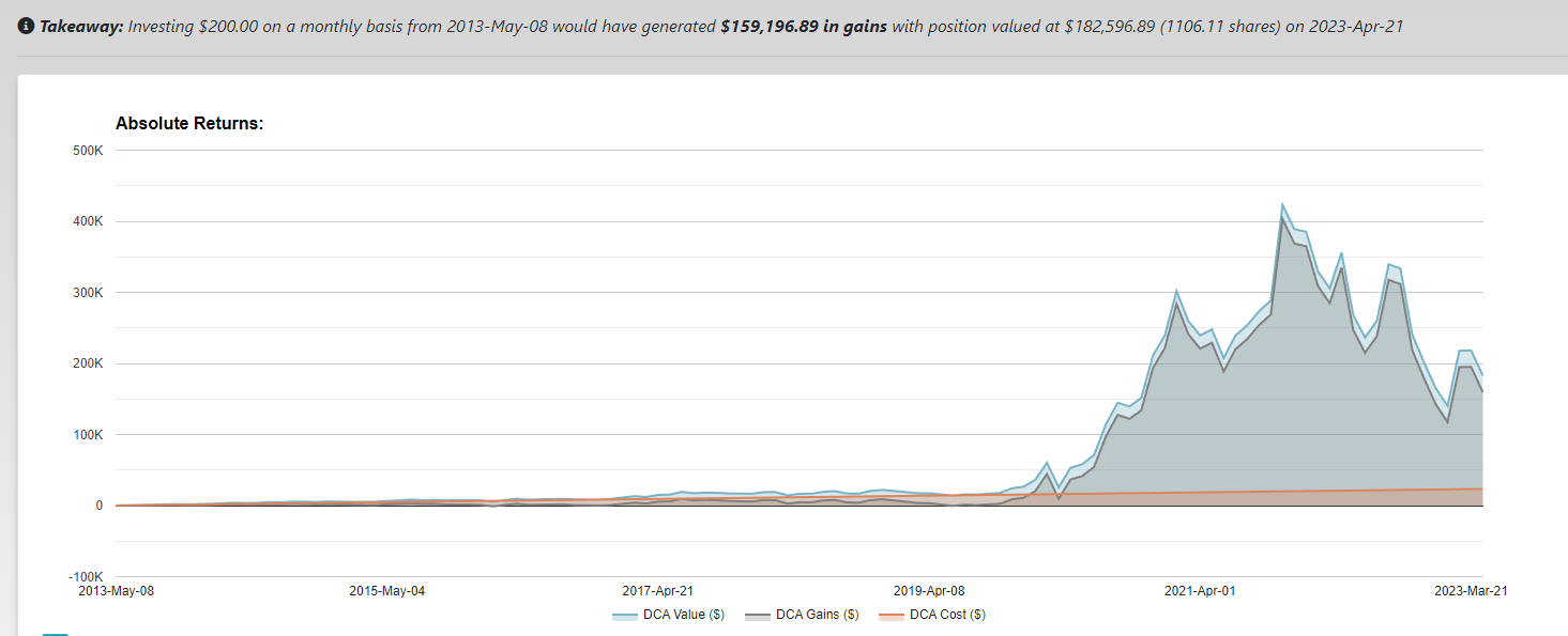 Ukážme si to na príklade, ak by sme každý mesiac posledných 10 rokov nakupovali bitcoin za 200 dolárov.