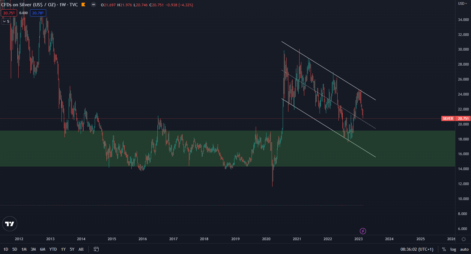 Na grafe nižšie môžeme vidieť spotovú cenu investičného striebra. Podľa údajov z TradingView sa obchoduje v čase písania článku na cenovej úrovni 20,75 doláru. Od začiatku augusta 2020 sa nachádza v dlhodobej korekcii, čo poskytuje investorom príležitosť nakupovať lacnejšie.