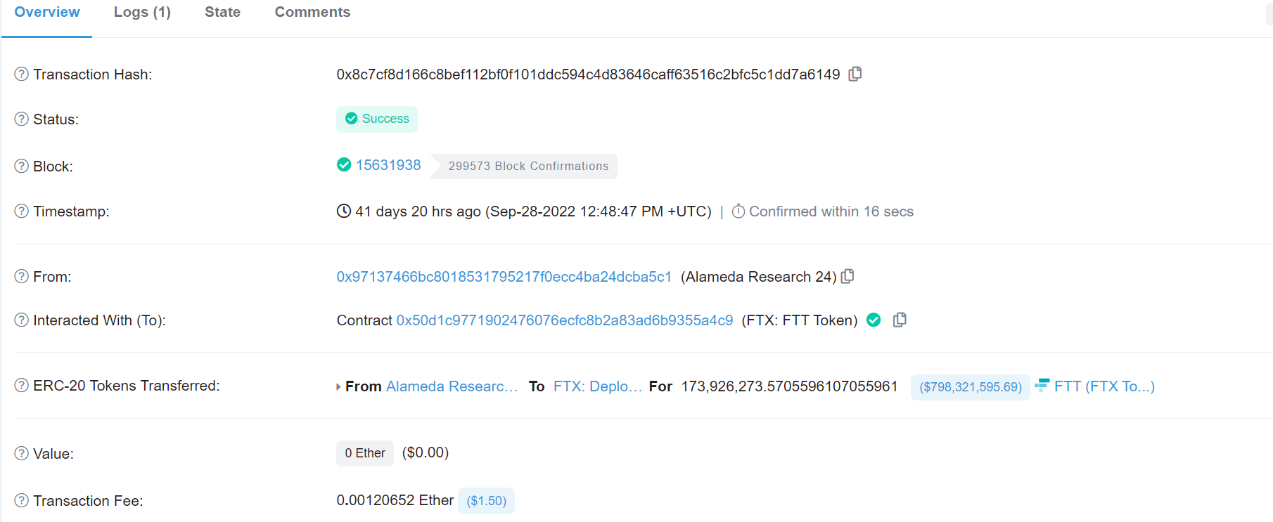 On-chain data confirms the same as the entire 173 million FTT tokens were then transferred from the Alameda Research address to an FTT ERC-20 deployer controlled by FTX.