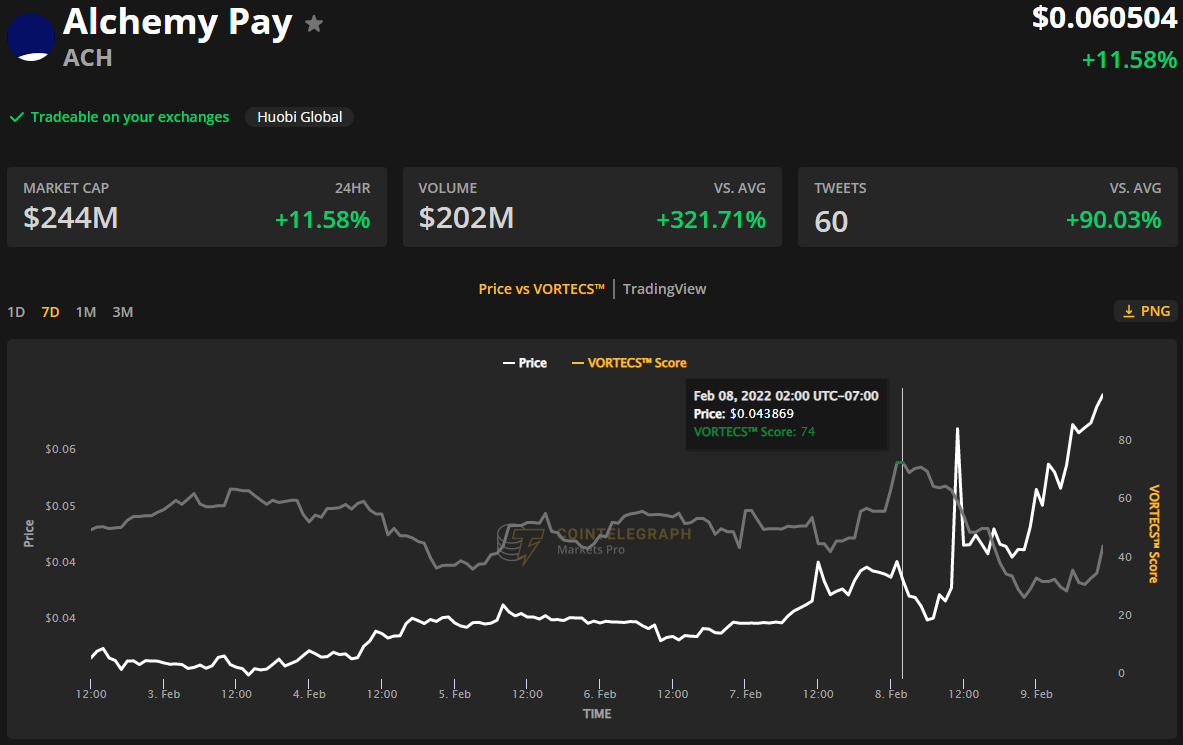 Alchemy Pay aims to further the adoption of cryptocurrencies through its hybrid payments system and in the last week its ACH token gained 77% to trade at $0.0625 on Feb. 9.